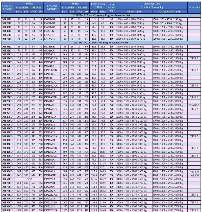 위치 및 용도에 따른 유형별 발전기 자료를 참고하세요.